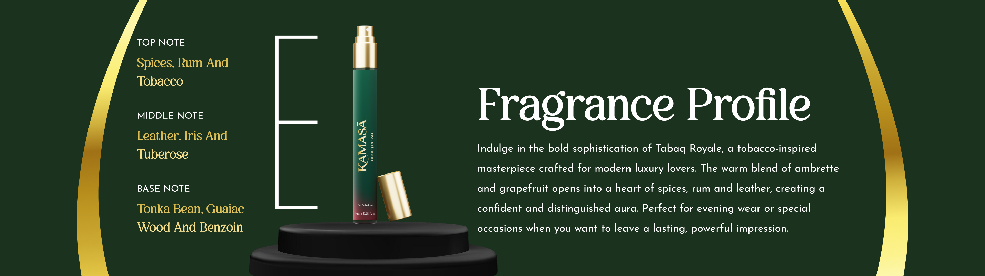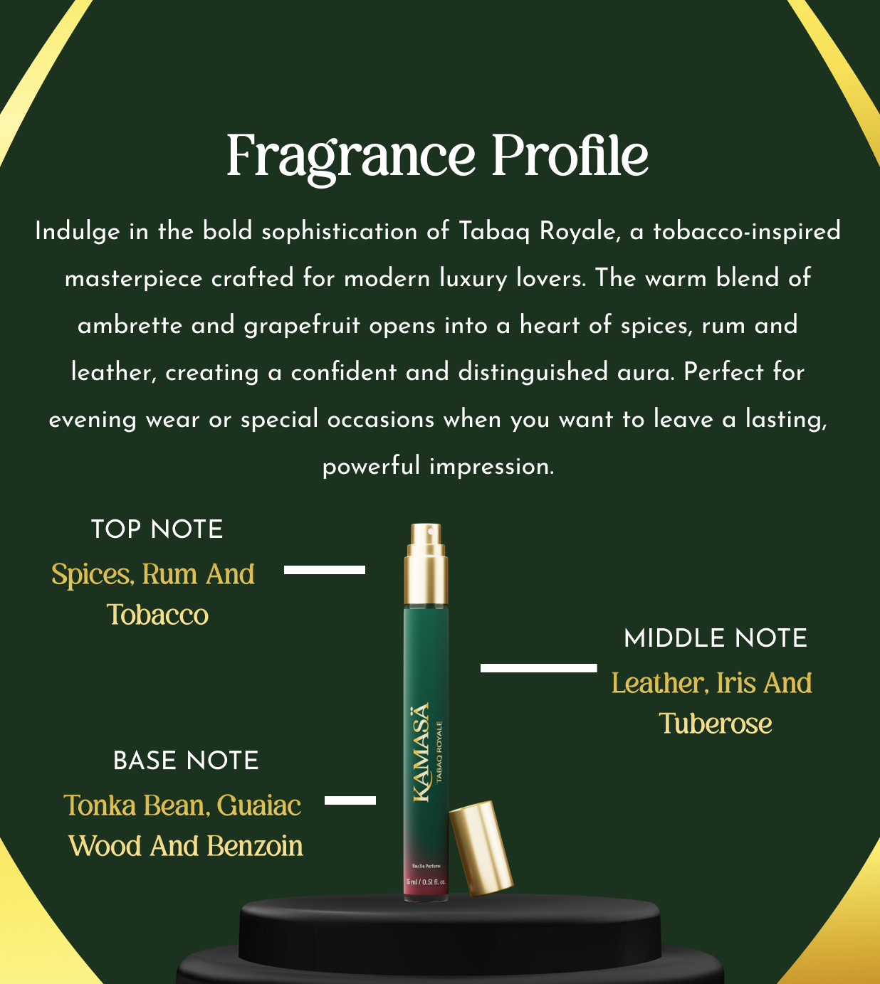 Free shipping on orders over $50. Standard delivery takes 3-5 business days.Indulge in the bold sophistication of Tabaq Royale — a tobacco-inspired masterpiece crafted for modern luxury lovers. The warm blend of ambrette and grapefruit opens into a heart of spices, rum, and leather, creating a confident and distinguished aura. Perfect for evening wear or special occasions when you want to leave a lasting, powerful impression.